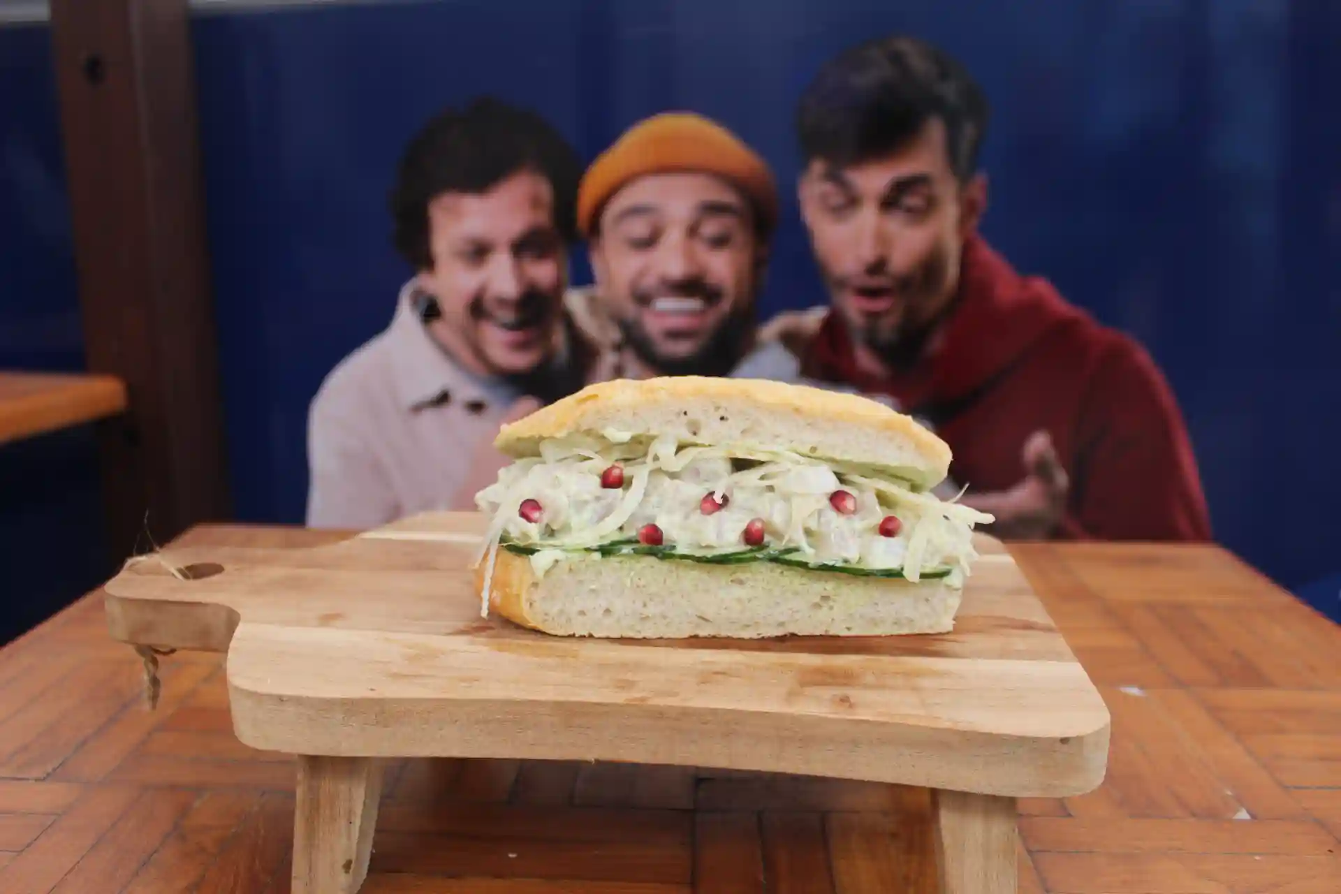 Chicken corn flakes, salad, tomato, onions, candied peppers, tandori mayo