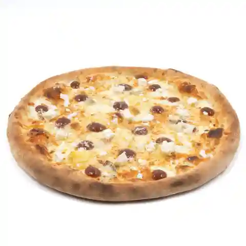 Mozzarella base, goat cheese, Gorgonzola, white ham, fresh cre…