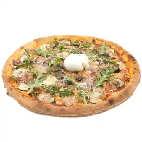 Tomato sauce, Eggplant, Zucchini, Fresh mushrooms, Mozzarella, Onions.
