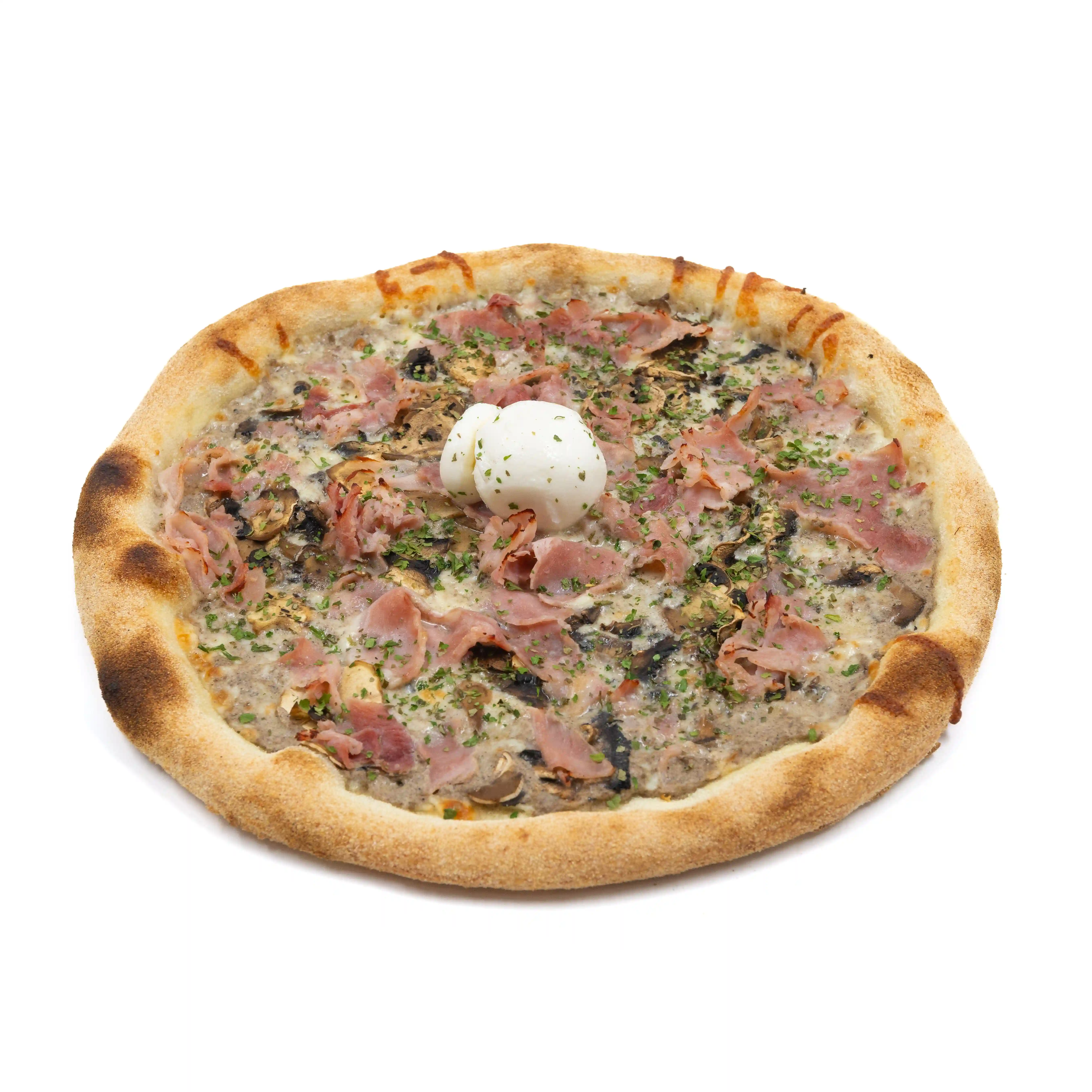 Tomato sauce, Mozzarella, White ham, Fresh mushrooms, Extra virgin olive oil, Oregano. After cooking: Egg
