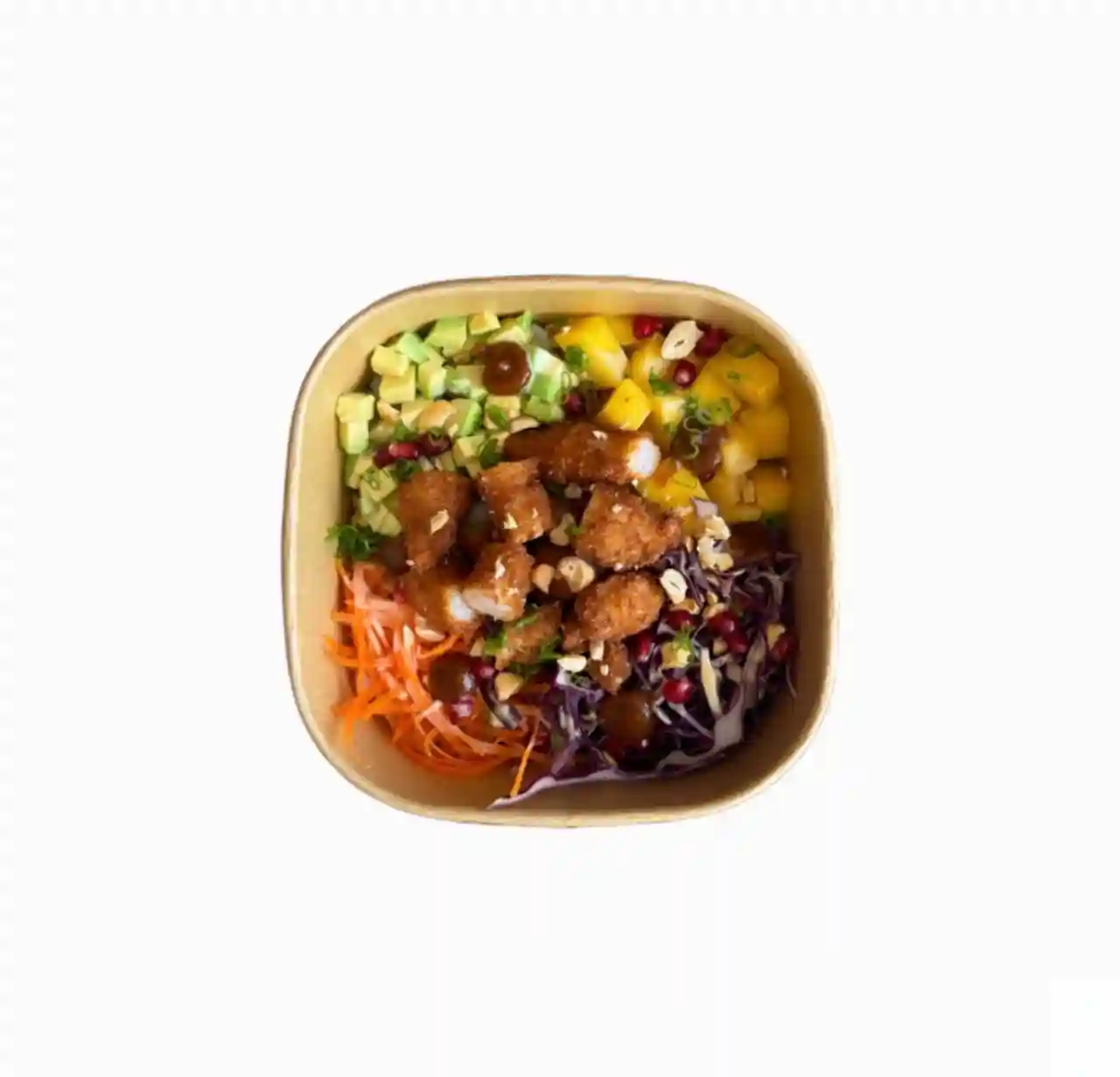 Choix de base, mangue, avocat, carotte, choux rouge, noix de cajoux, grenade, sauce tropicale, gel ponz…