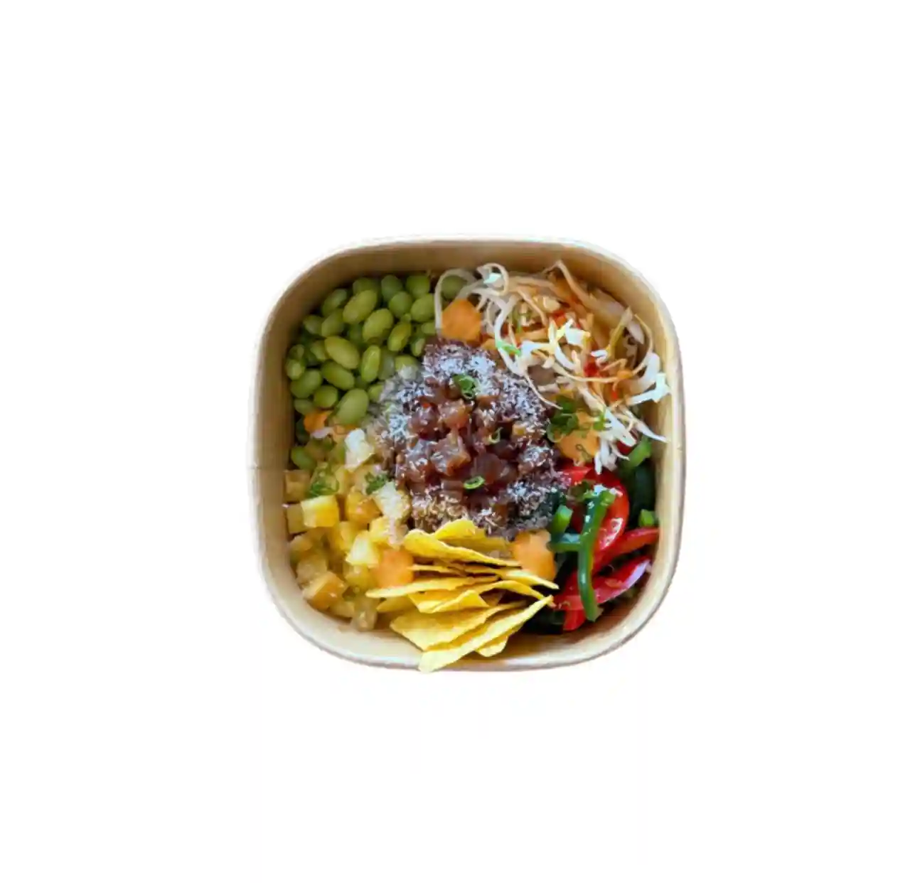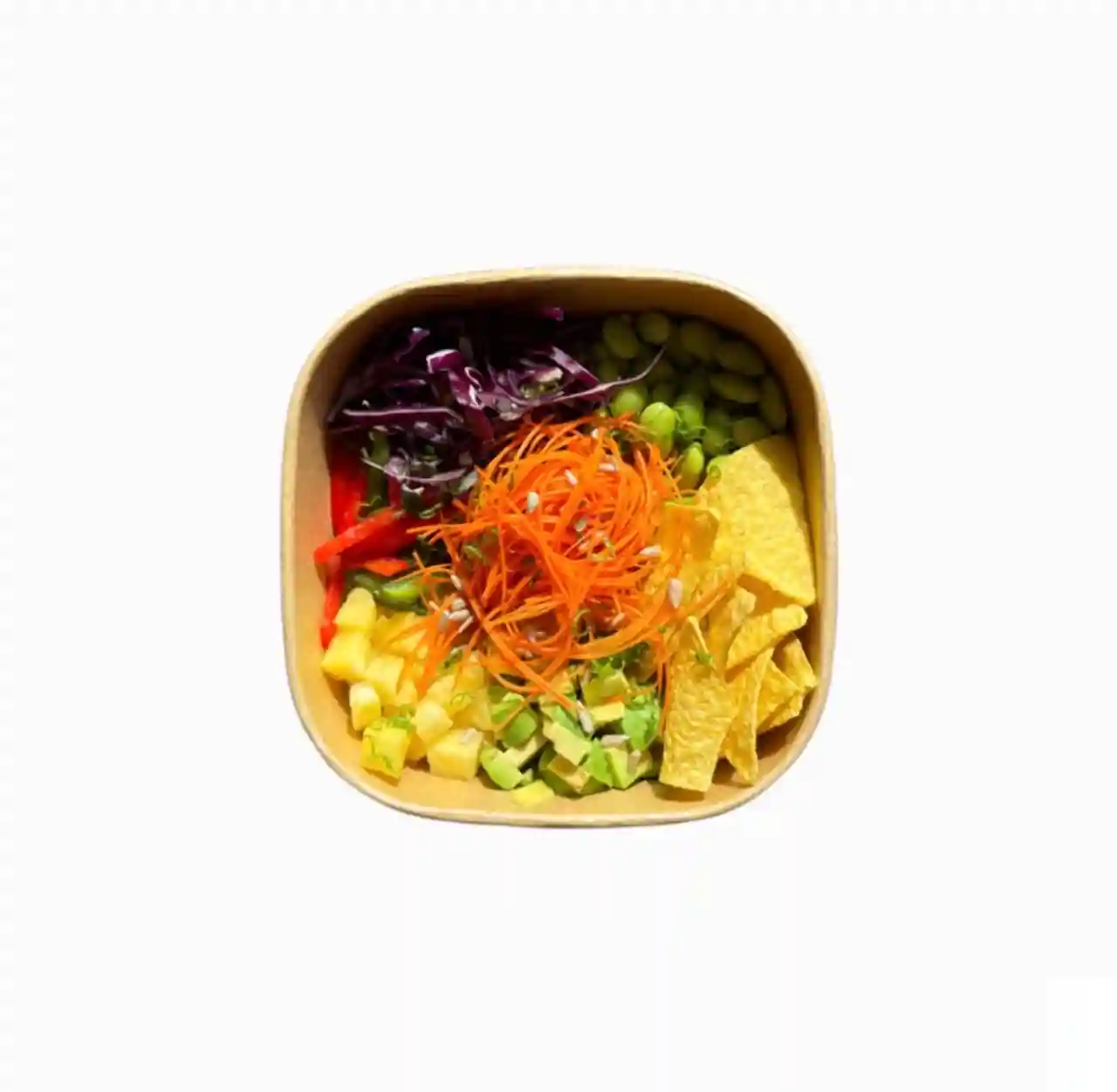 Choix de base, ananas, poivrons, choux mariné, edamame, chips de tortilla,…