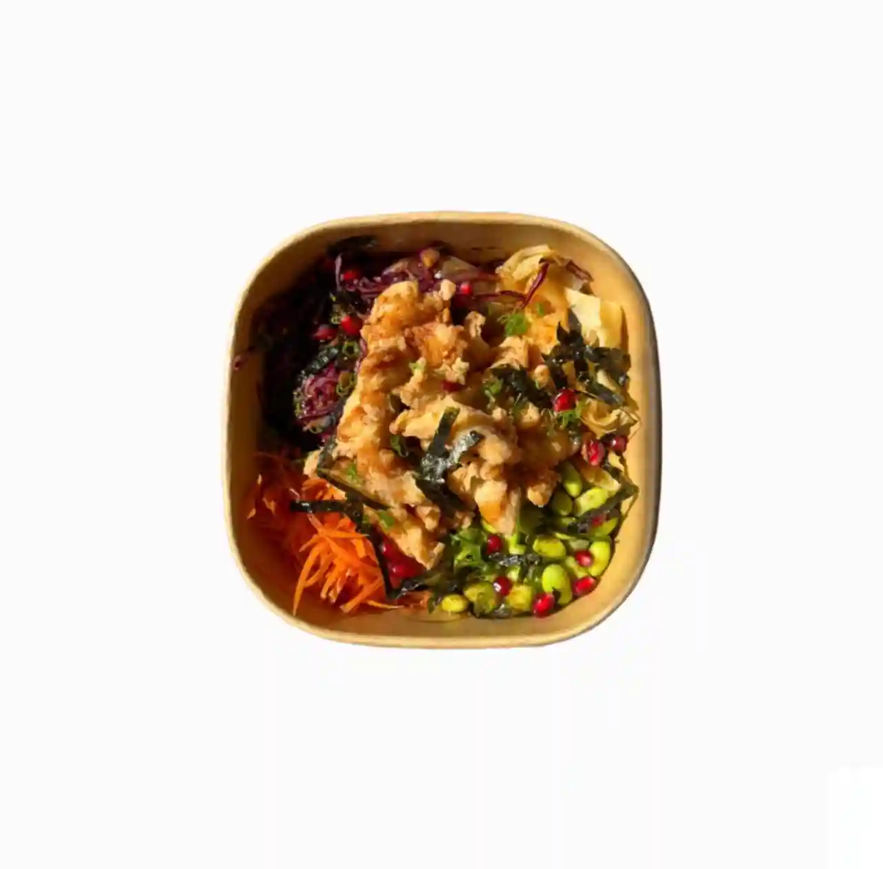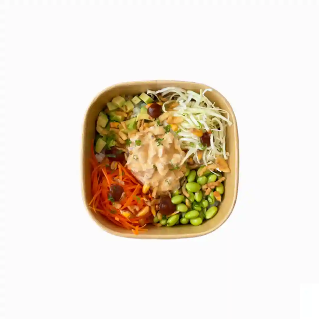 Choix de base, carotte, edamame, gari, choux rouge mariné, nori, grenade, yuzu chili mayo, sauce tare, ci…