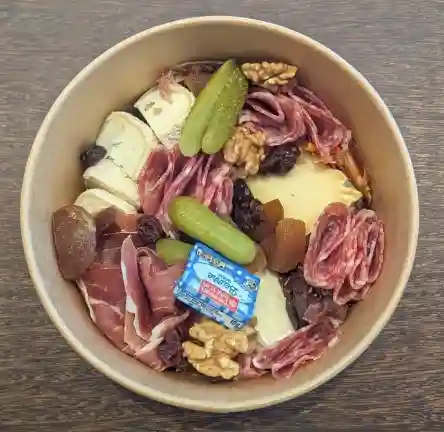 Poulet, bacon, oignon, mayonnaise moutarde à l'ancienne avec pommes de terre frappées ou salade verte