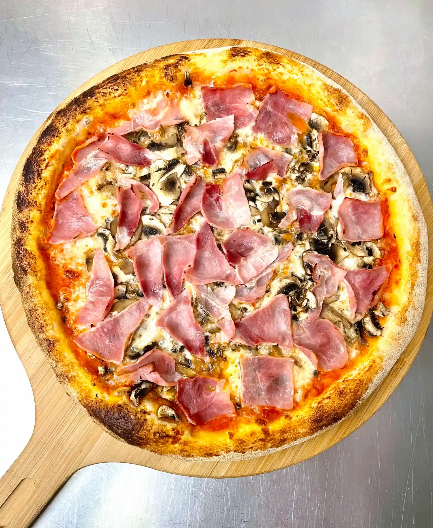 Sauce tomate, Mozzarella, Jambon blanc, Champignons frais, Huile d'olive extra vierge, Origan.