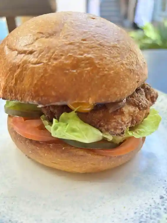 Suprême de volaille frit, pains brioché, sauce barbecue,tomates, pickles de concombre, oignons