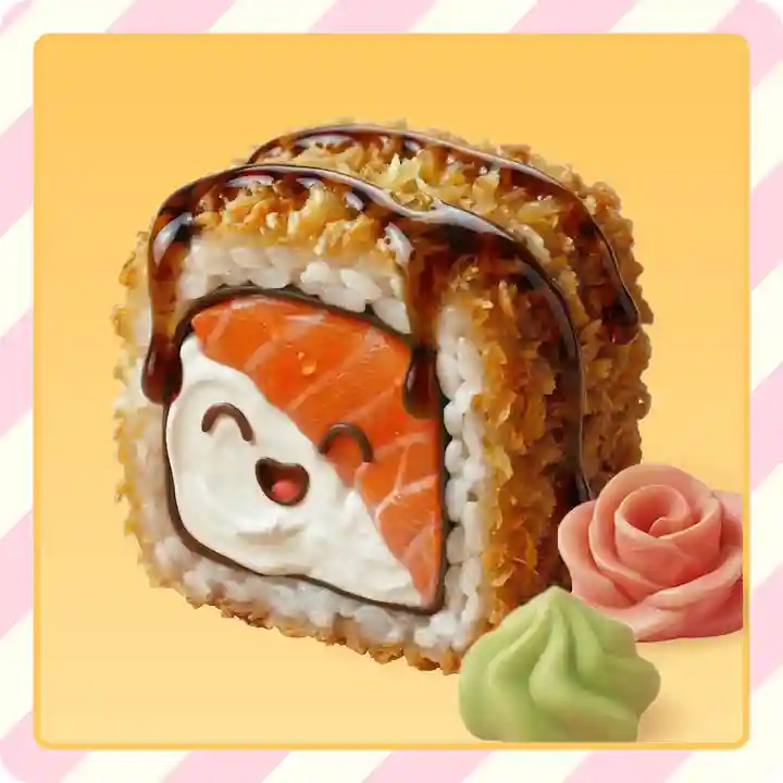 Intérieur : california roll frit, saumon, cream cheese, cive, nori, riz vinaigré