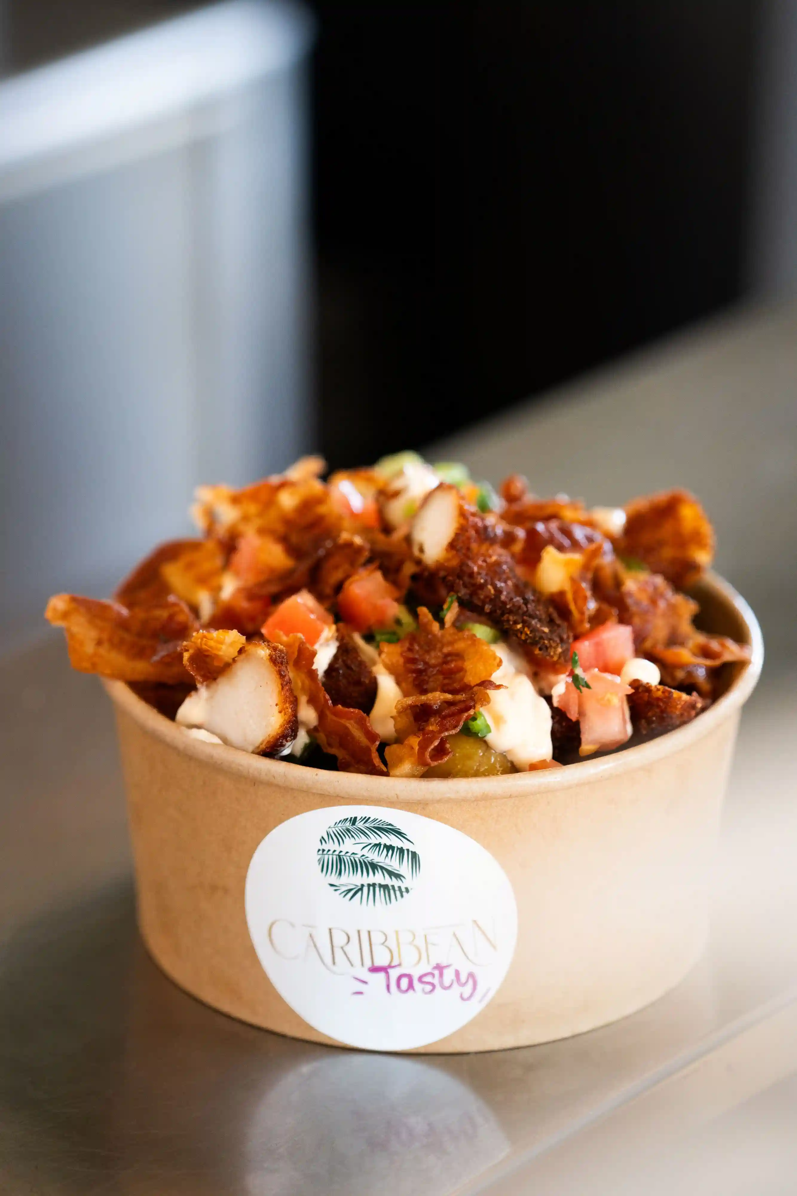 Salade fraîche, guacamole, chutney banane plantain, tenders poulet crispy, mayonnaise piment végétarien
