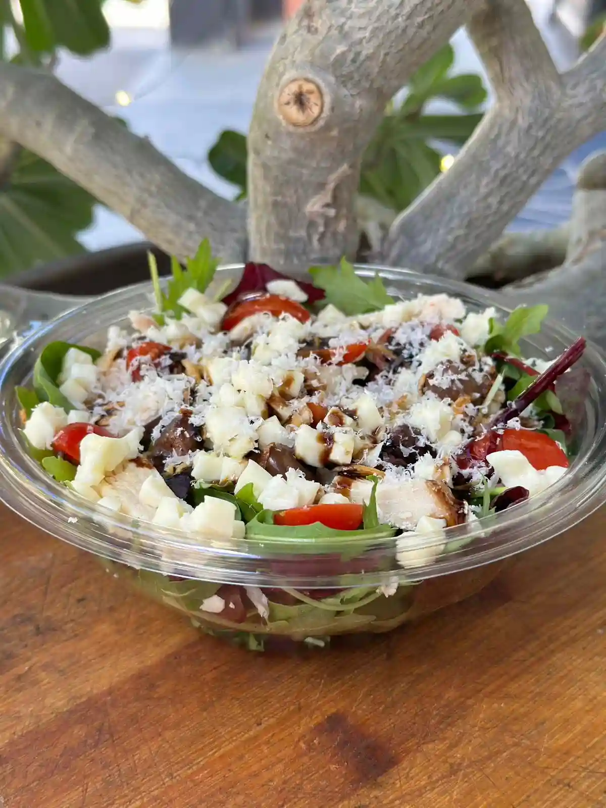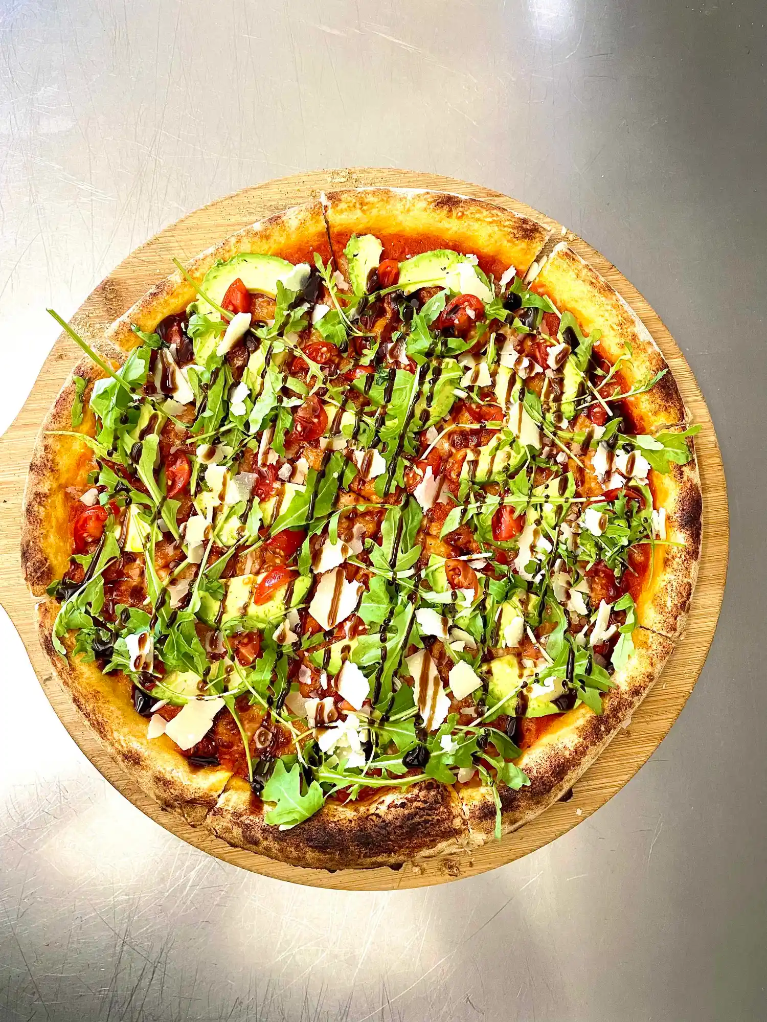Arugula, chicken, mozzarella, fried onions, cherry tomatoes, olives, parmesan, olive oil, balsamic cream.