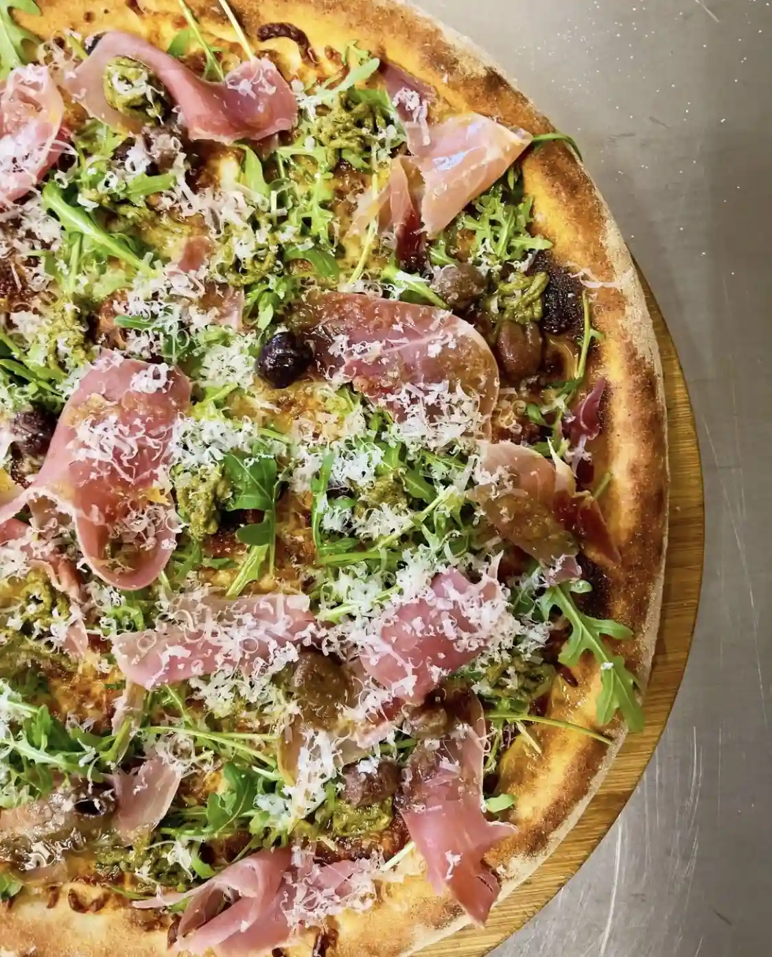 Arugula, mozzarella, cured ham, cherry tomatoes, olives, parmesan, olive oil, truffle balsamic cream