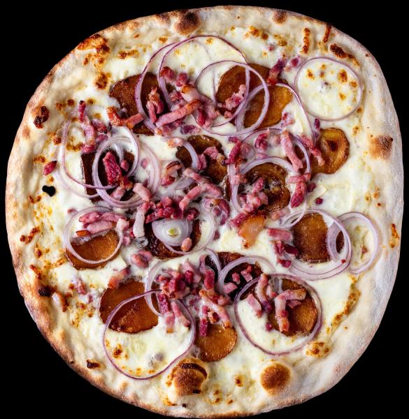 Mozzarella, potatoes, bacon, raclette cheese, onions