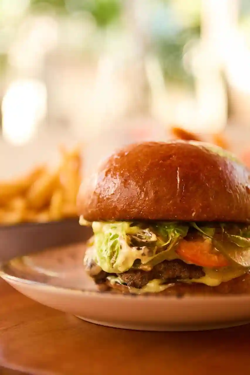 Ground beef steak, cheddar cheese, onion compote, cucumber pickles, tomatoes, salad, brioche bun, Béarnais sauce with F…