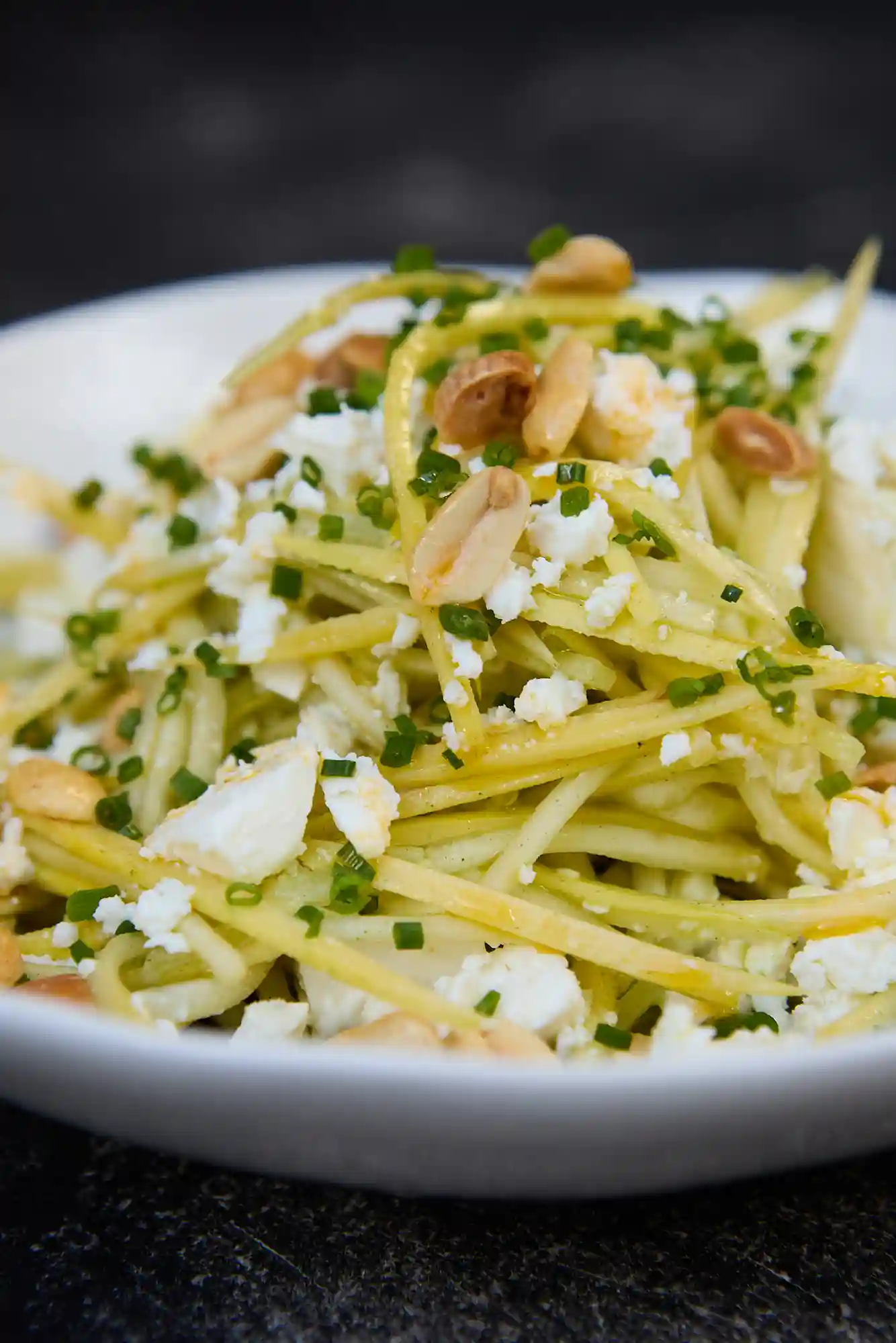 Zucchini spaguetti, basil & elderberry, peanut & almond vinaigrette