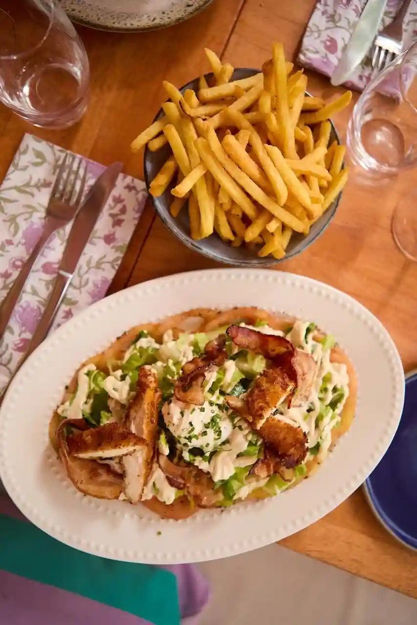 Fried chicken, cucumber pickles, homemade barbecue sauce, honey mustard