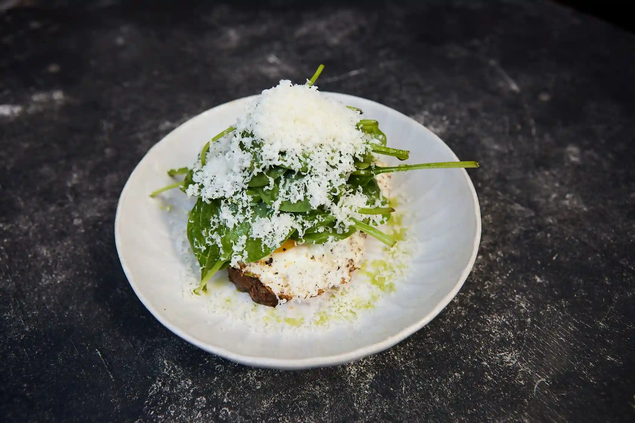 Fried egg, fresh spinach, parmesan, dark cereal bread, guacamole