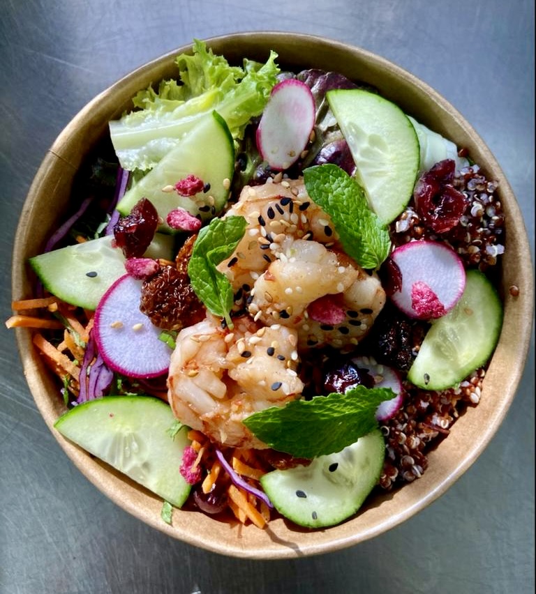 Shrimp Salad, Green Salad, quinoa, carrot, mango, roasted sweet potato, mint, cucumber, radish