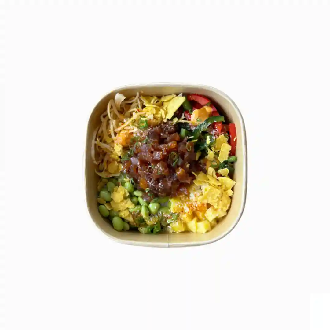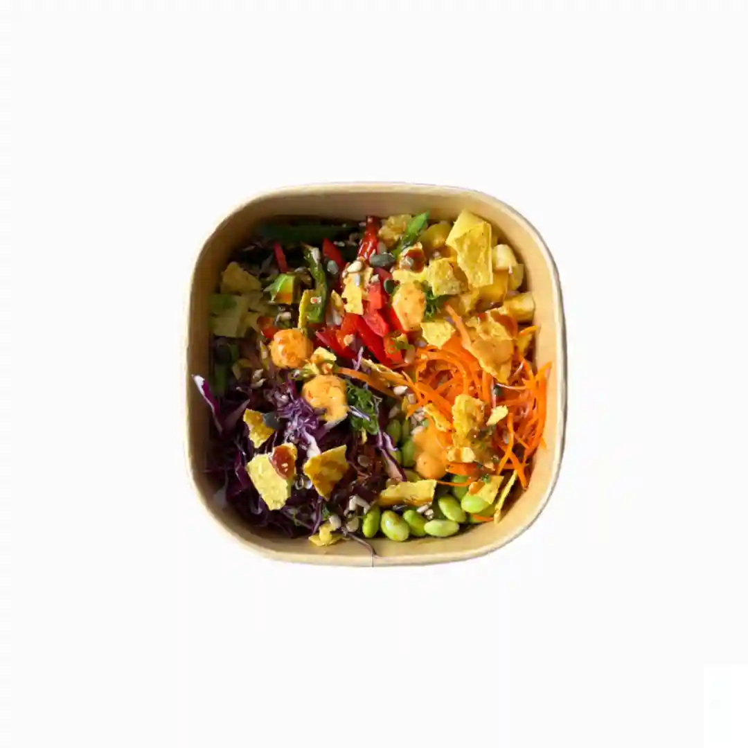 Choix de base, ananas, poivrons, choux mariné, edamame, chips de tortilla, spicy mayo, sauce passion ro…
