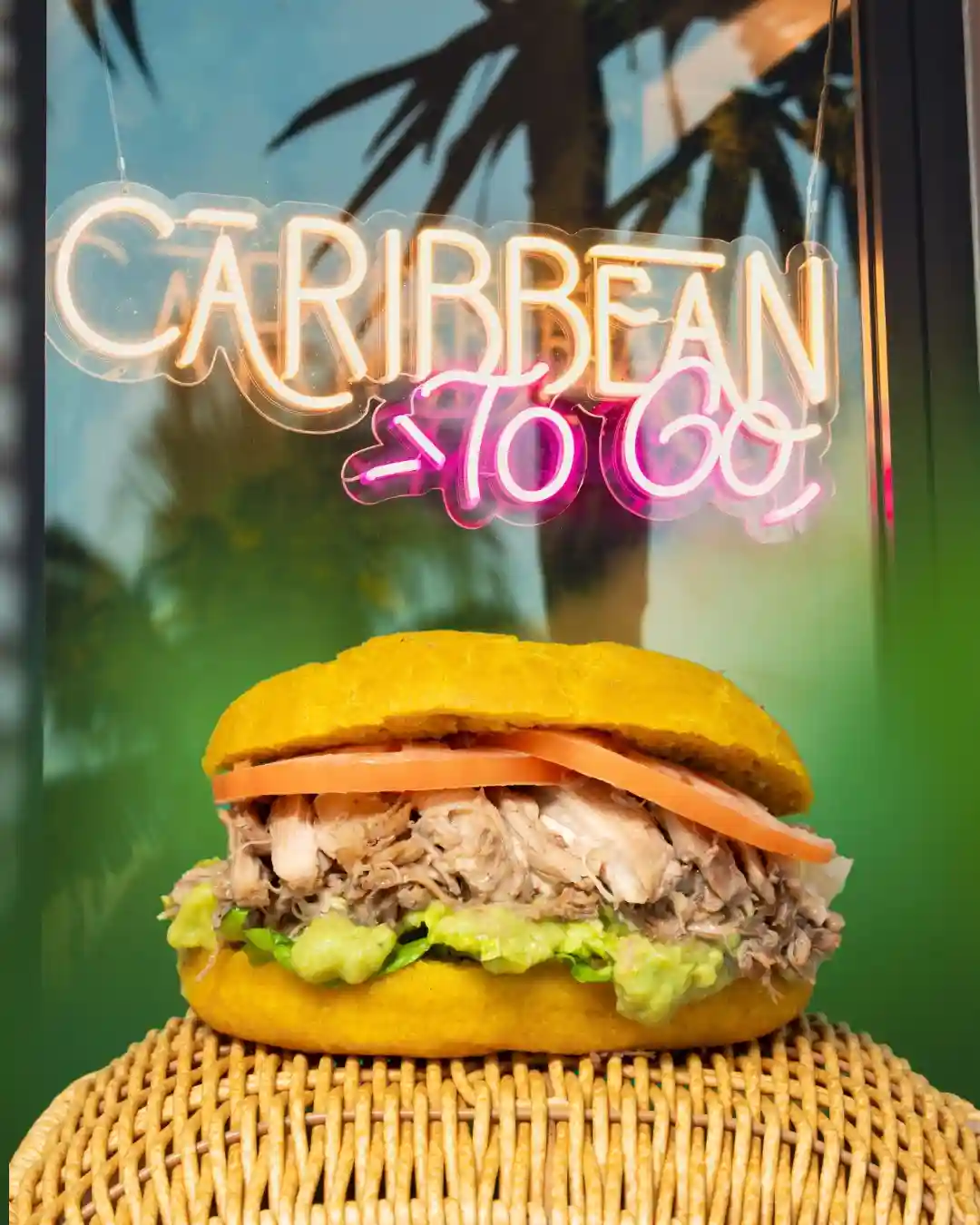 Salade fraîche, guacamole, chutney banane plantain, poulet boucané, mayonnaise piment végétarien