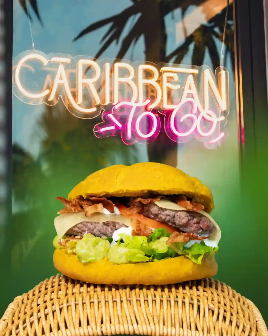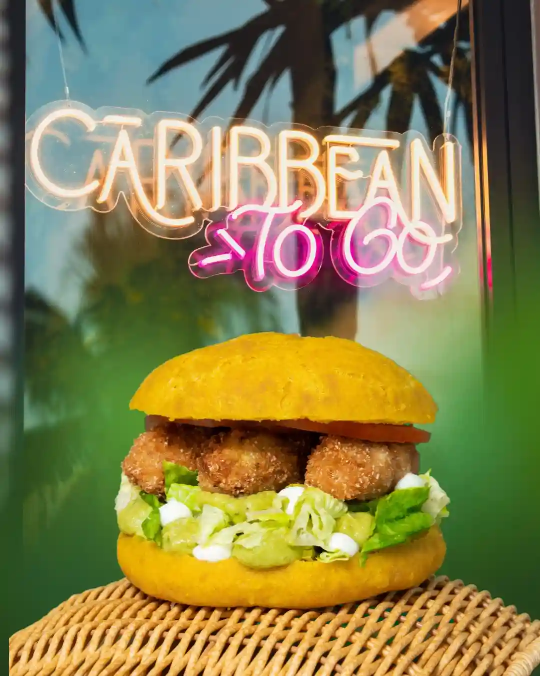 Riz coco, banane plantain frit, oignons crispy, oignons péyi, mayonnaise piment végétarien, steak végétarien