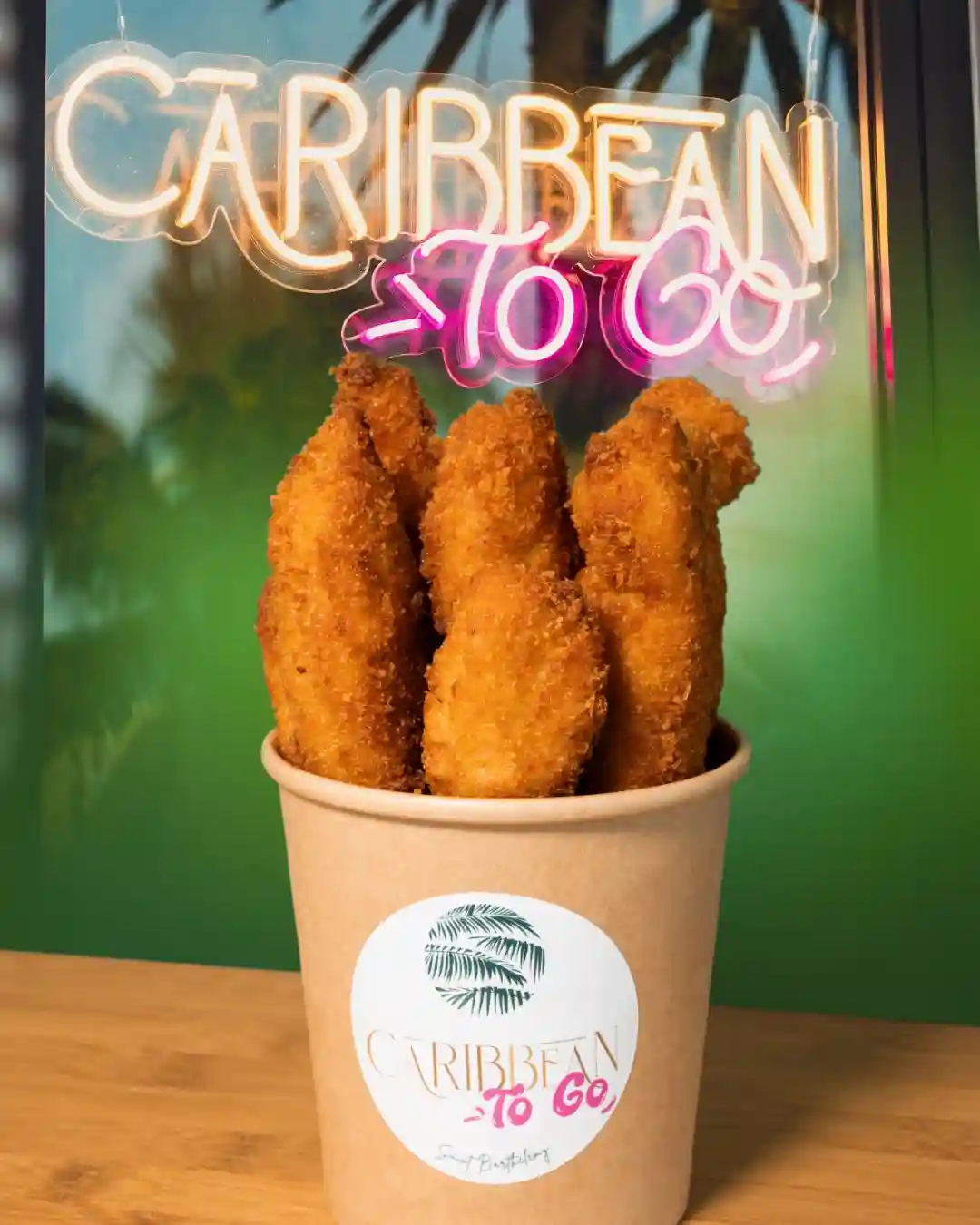 Salade fraîche, guacamole, chutney banane plantain, tenders poulet crispy, mayonnaise piment végétarien