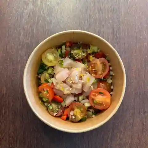 Crudo de pêche locale, tomate cerise, concombre, poivron rouge, oignon rouge, jalapenos, vinaigrette yuzu et jalapenos