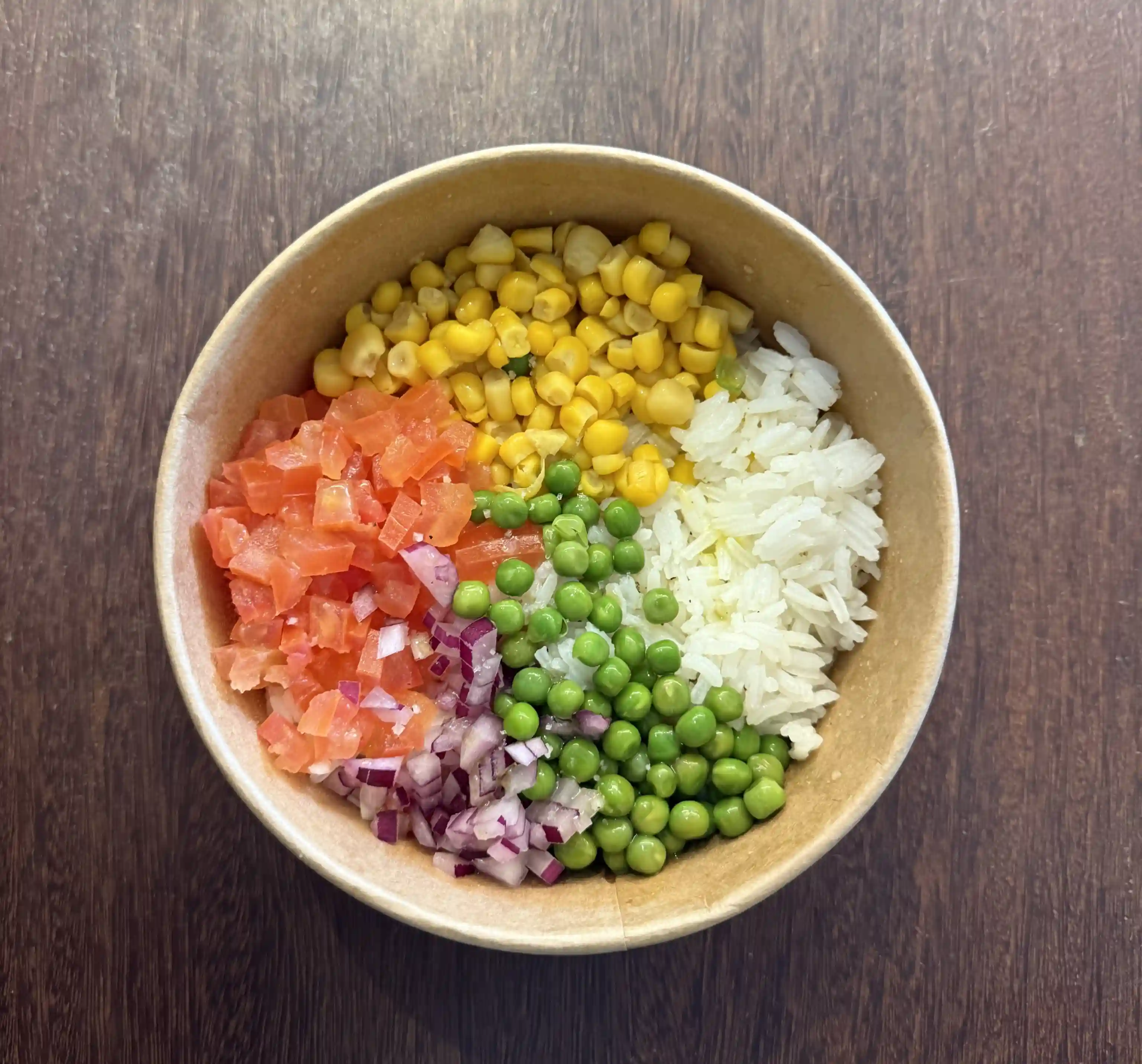 Riz basmati, tomate, maïs, petit pois, oignon rouge