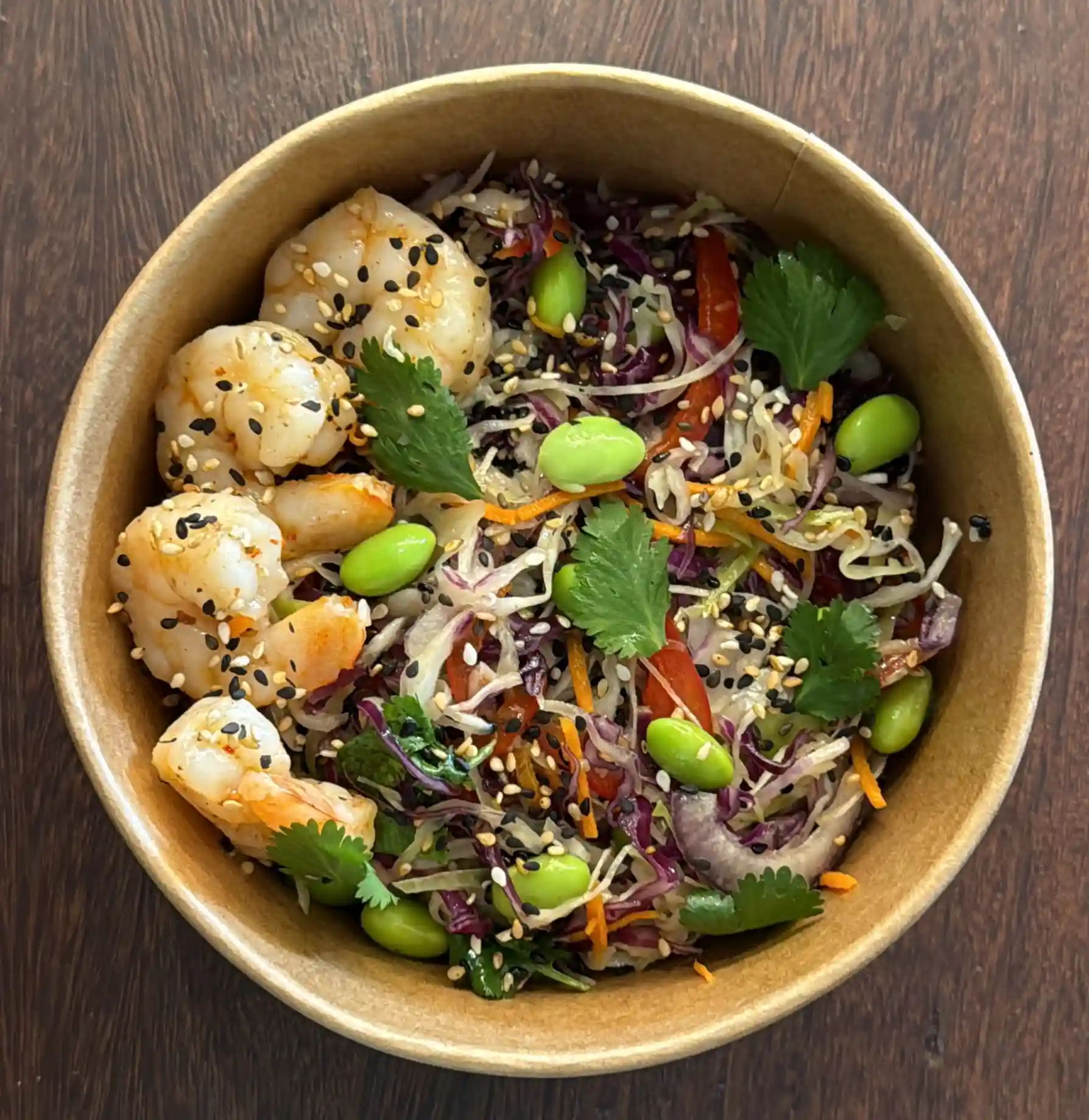 Chou rouge, chou blanc, gambas, poivron rouge, carotte, edamame, oignon rouge, sésame, coriandre