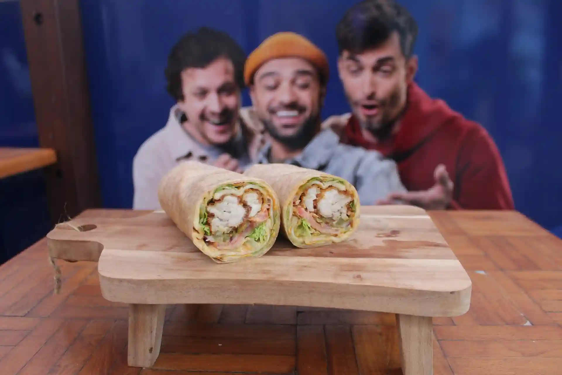 Poulet corn flakes, salade, tomate, oignons, , poivrons confit, mayo tandori