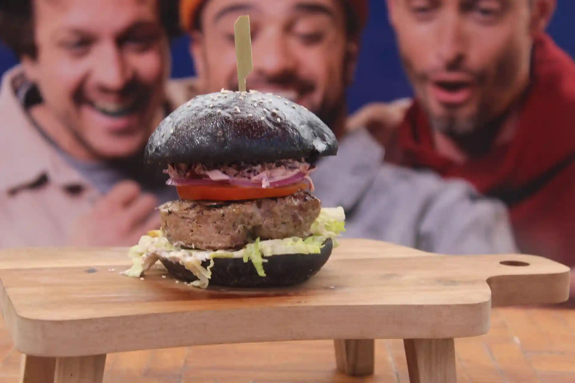 Bun's encre de seiche, steak, salade, tomate, coleslaw, pickles oignon, crémeux béarnaise