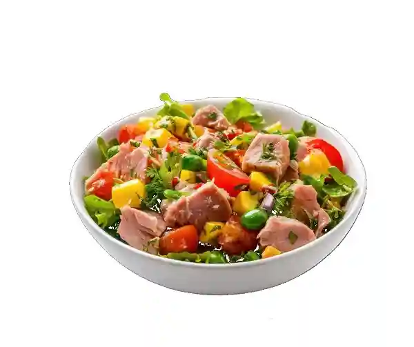 Salade romaine, tomates, concombres, carottes, maïs, emmental, thon, vinaigrette maison