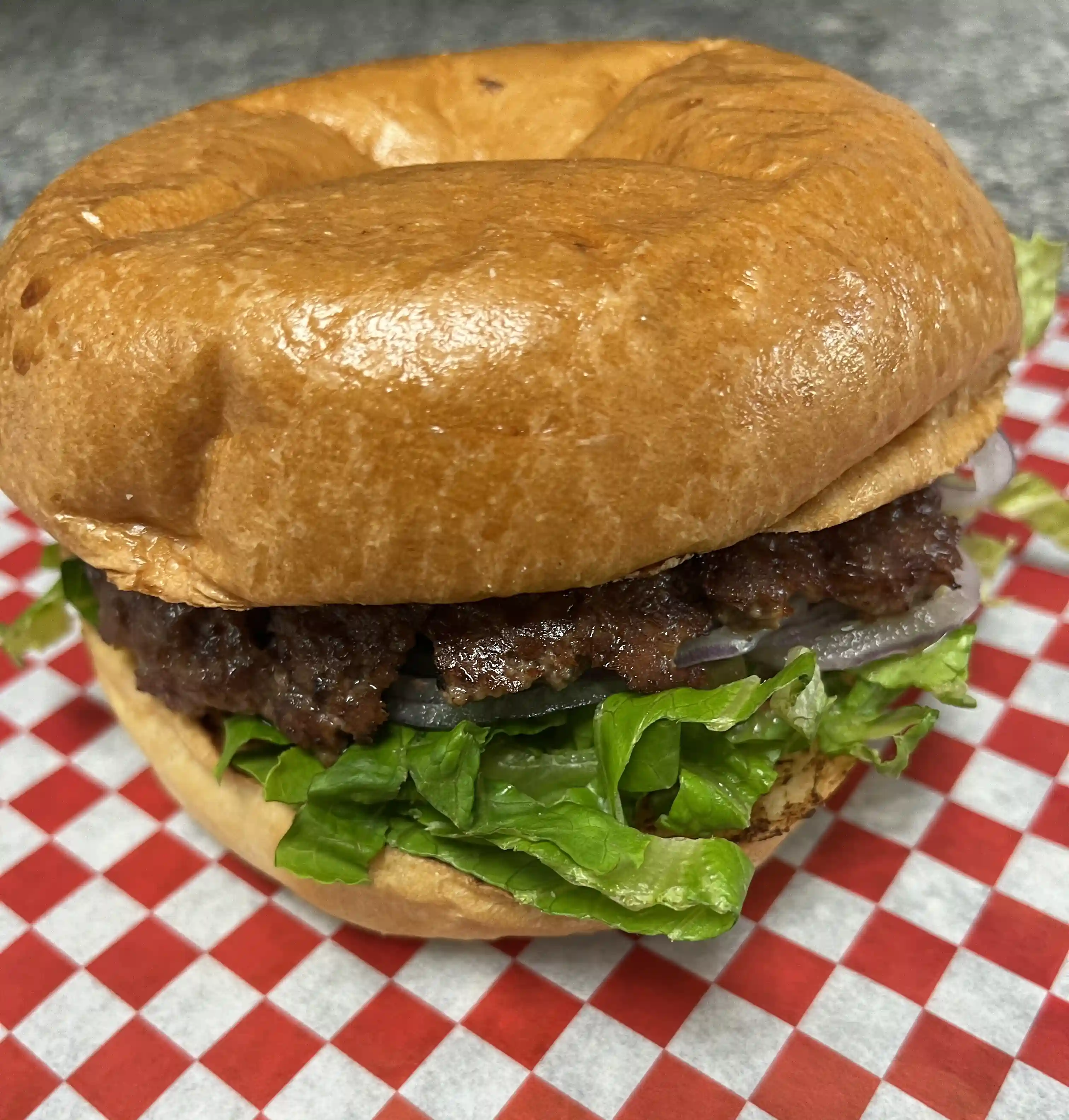 Boeuf haché angus, salade,tomates, oignons cru , pickles, sauce burger