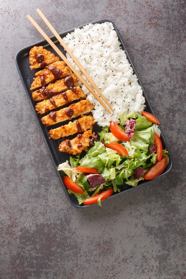 Katsu chicken, Blanc de Poulet, Blanc de poulet panko frit, Sauce teriyaki, Sauce spicy mayo, Cives